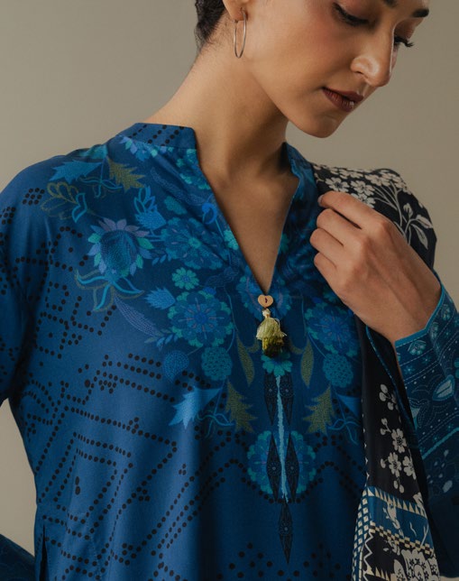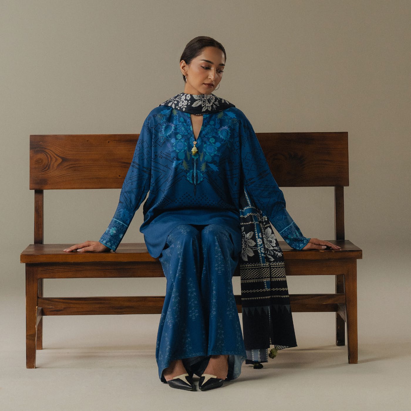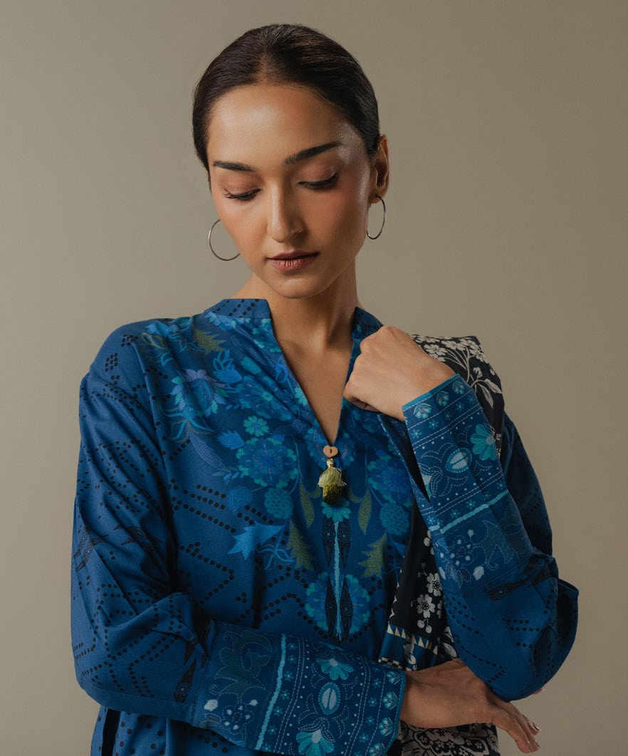 blue trousers featuring delicate block print motifs. The ensemble is finished with a black and gray checked